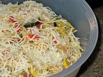 Brush a grill pan with olive oil and heat. Place veggie slices in the pan and season with salt and pepper; grill until slightly browned and tender. Set aside to cool. When cool, cut veggies into smaller pieces (i.e., cut zucchini slices in half so they are easier to eat!). Toss veggies with pasta and a handful of cheese; drizzle with a little olive oil and toss again. Top with a couple more handfuls of cheese and salt and pepper to taste. Serve chilled.